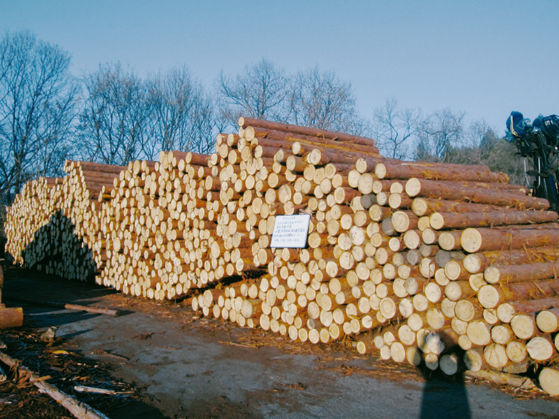 山から切り出された間伐材、木材は原木集積場に集められます。当社では、適切に間伐された栃木県産間伐材を利用します。