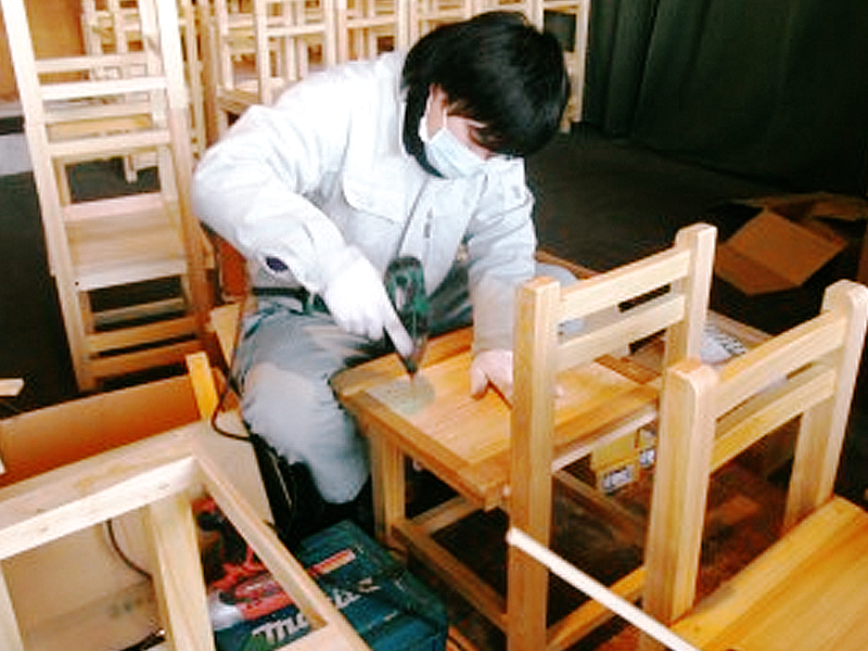 星野工業の職員が実際に各学校、幼稚園まで届けています。新しい学習机や椅子に喜ぶ子供たちの姿を見ることが私たちの喜びになっています。